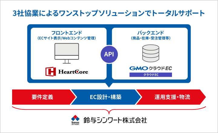 複数サイトの運営・一元管理に最適な「GMOクラウドEC」と「HeartCore」によるサイト構築を、両サービスの開発パートナーとしてCMSおよびECサイト構築に豊富な経験がある鈴与シンワートが推進いたします。