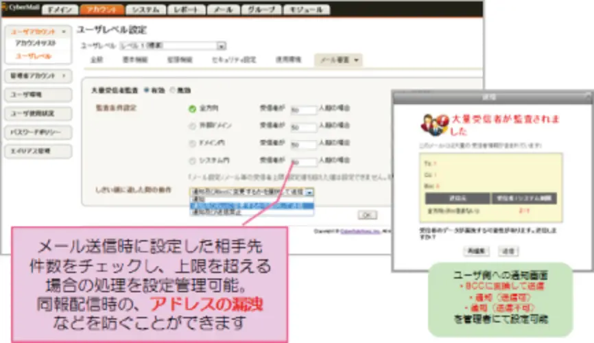 30レベルそれぞれで詳細なメール使用ポリシーの適用が可能。