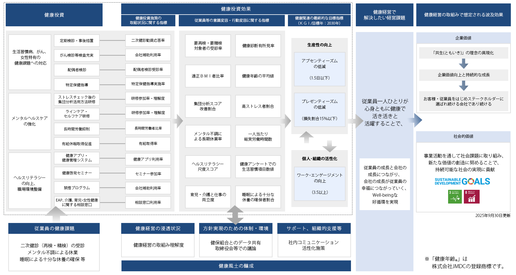 従業員が心身ともに健康で活き活きと活躍することが、「共生」の理念を具現化し、弊社の企業価値向上と持続的成長を促し、お客様に常に選ばれる会社であり続けていくことに繋がるものと考えています。