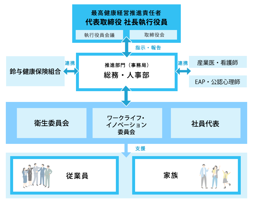 経営トップである社長執行役員が健康経営推進最高責任者として、健康経営に取り組んでいます。また、執行役員会議・取締役会に、月次で社員の健康状態や施策の実施状況を報告し、経営層を巻き込んだPDCAによる健康経営の継続的な改善を図っています。