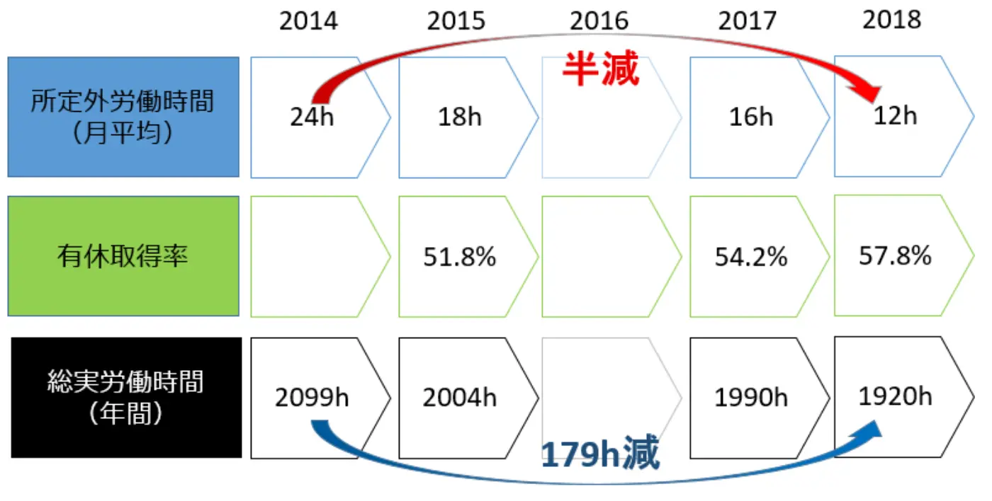 その結果、2014年度には2,099時間あった総実労働時間は2018年度には1,920時間にまで改善しています。