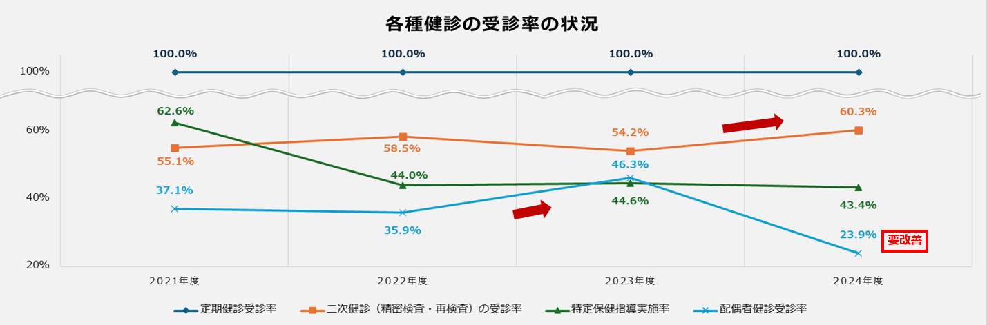 3. 定期健康診断の100%受診と二次健診受診率向上(80%以上)、配偶者健診の充実